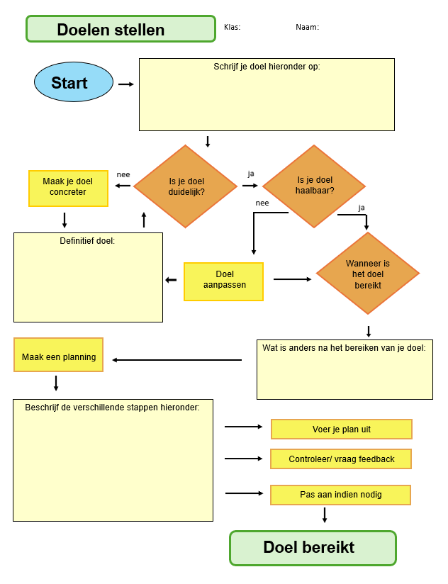 Leerlingen/studenten formuleren concrete doelen. Waar willen ze aan werken dit schooljaar en waarom is dat voor hen belangrijk? Bonus: Het werkblad geeft houvast voor een (mentor)gesprek.